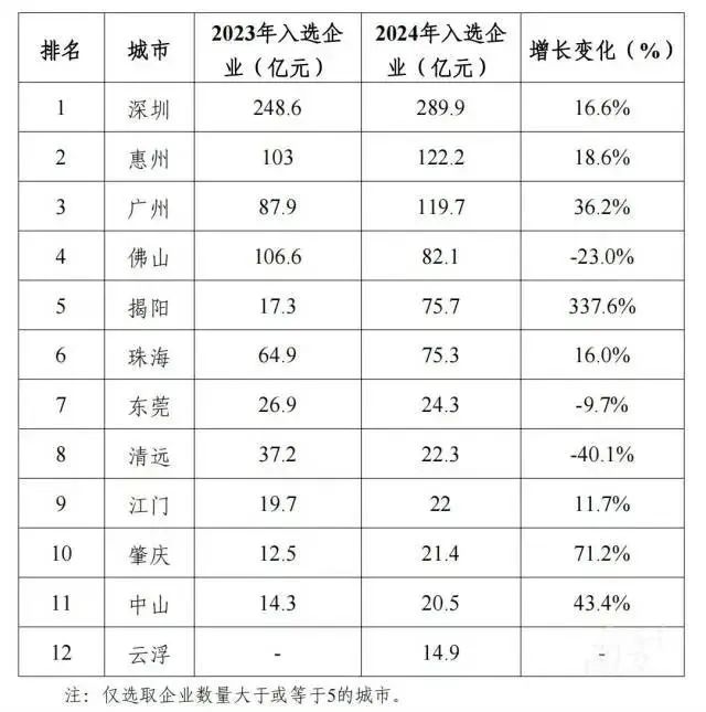 从区域分布看,佛山入选企业最多,数量为102家;其次为深圳93家、江门64家、广州58家、东莞52家、珠海42家。紧随其后的是第二梯队的惠州、揭阳、中山,入选企业数量均在10—30家之间。位居第三梯队的是肇庆、清远、云浮,入选企业数量均少于10家。