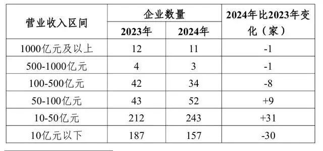 从营业收入规模区间来看,100亿—500亿元、500亿—1000亿元、1000亿元及以上的头部企业数量均同比减少;营业收入50亿元以下的企业有400家,占总数的80%,呈现二八分布结构。